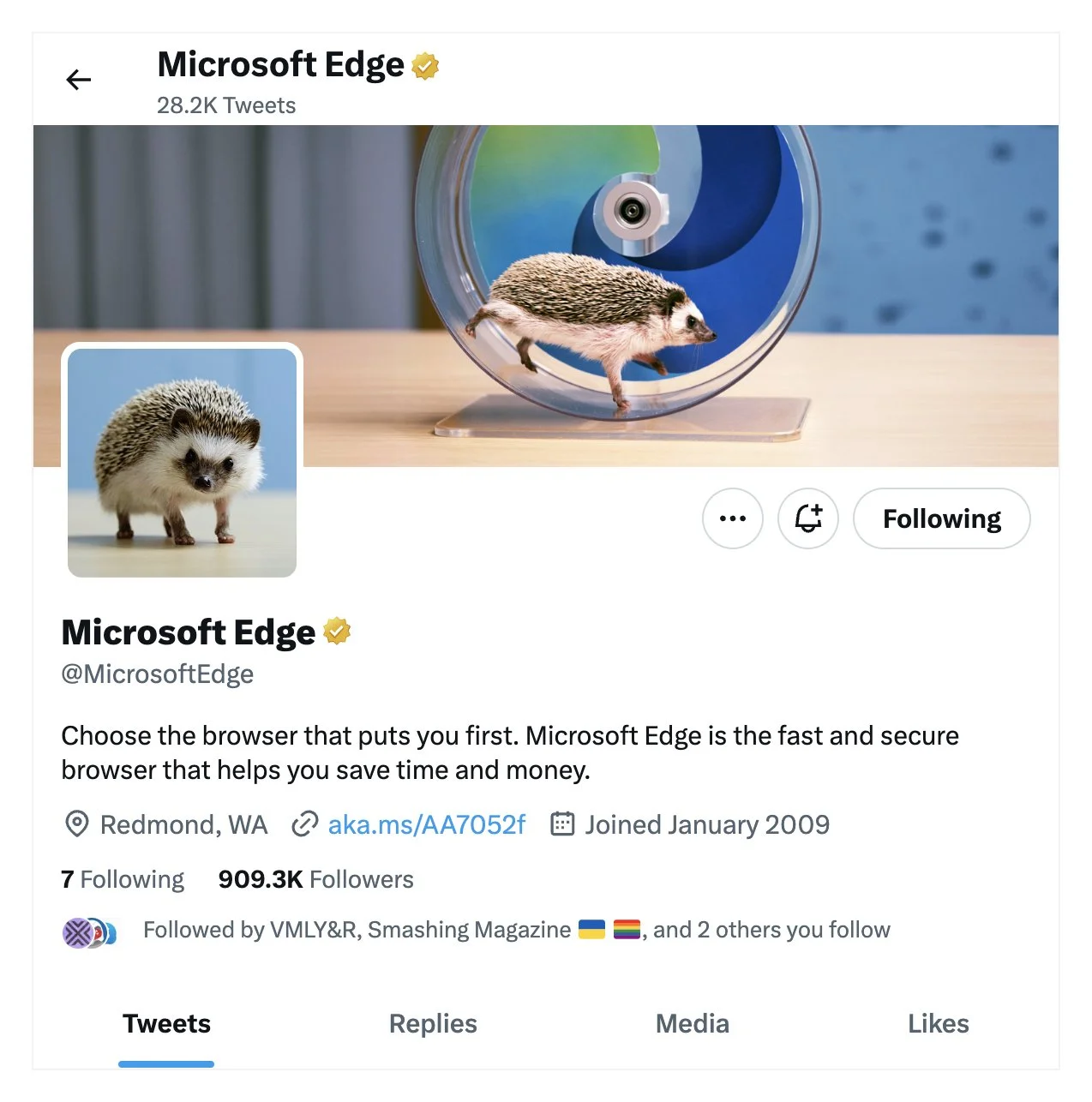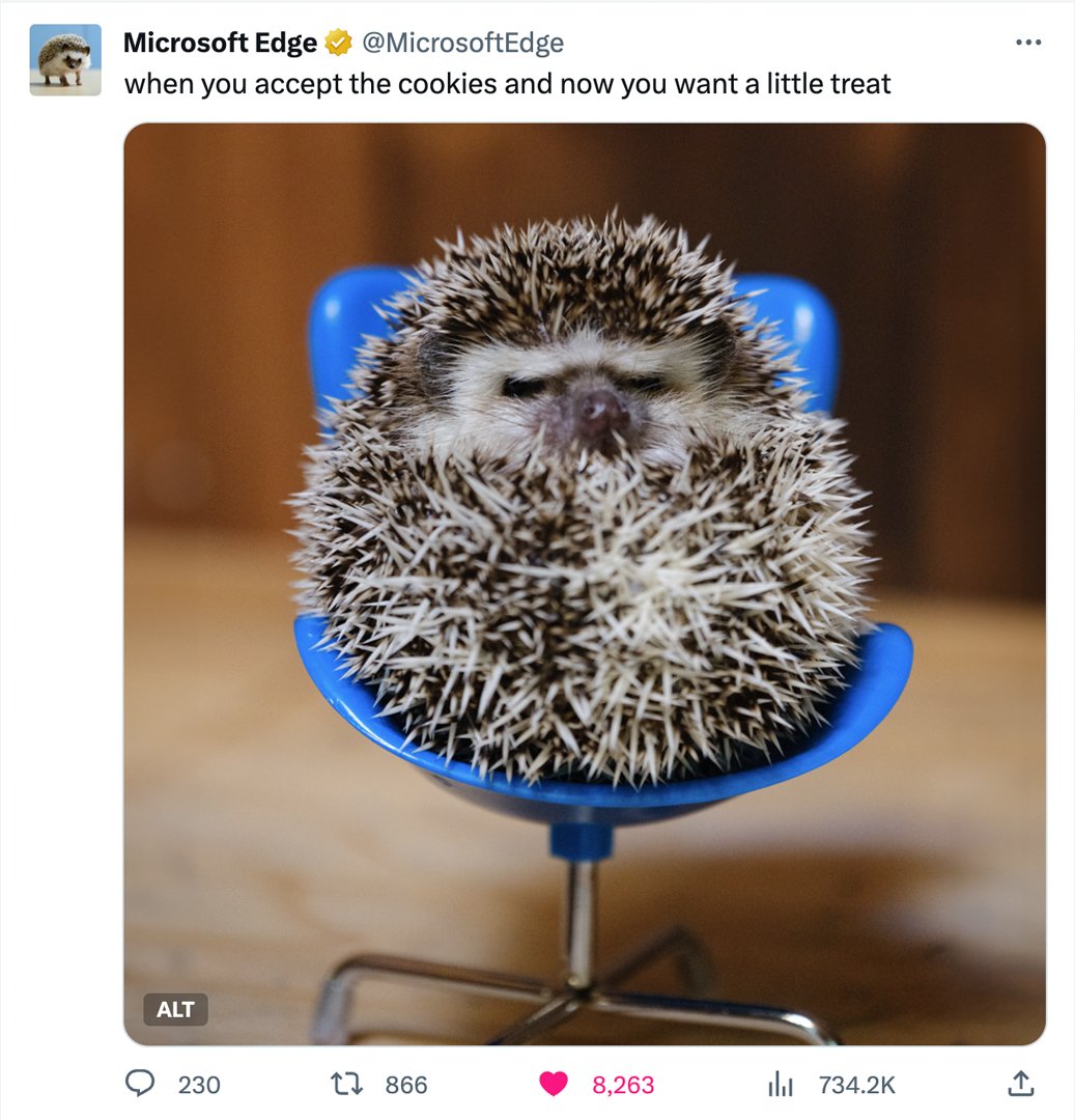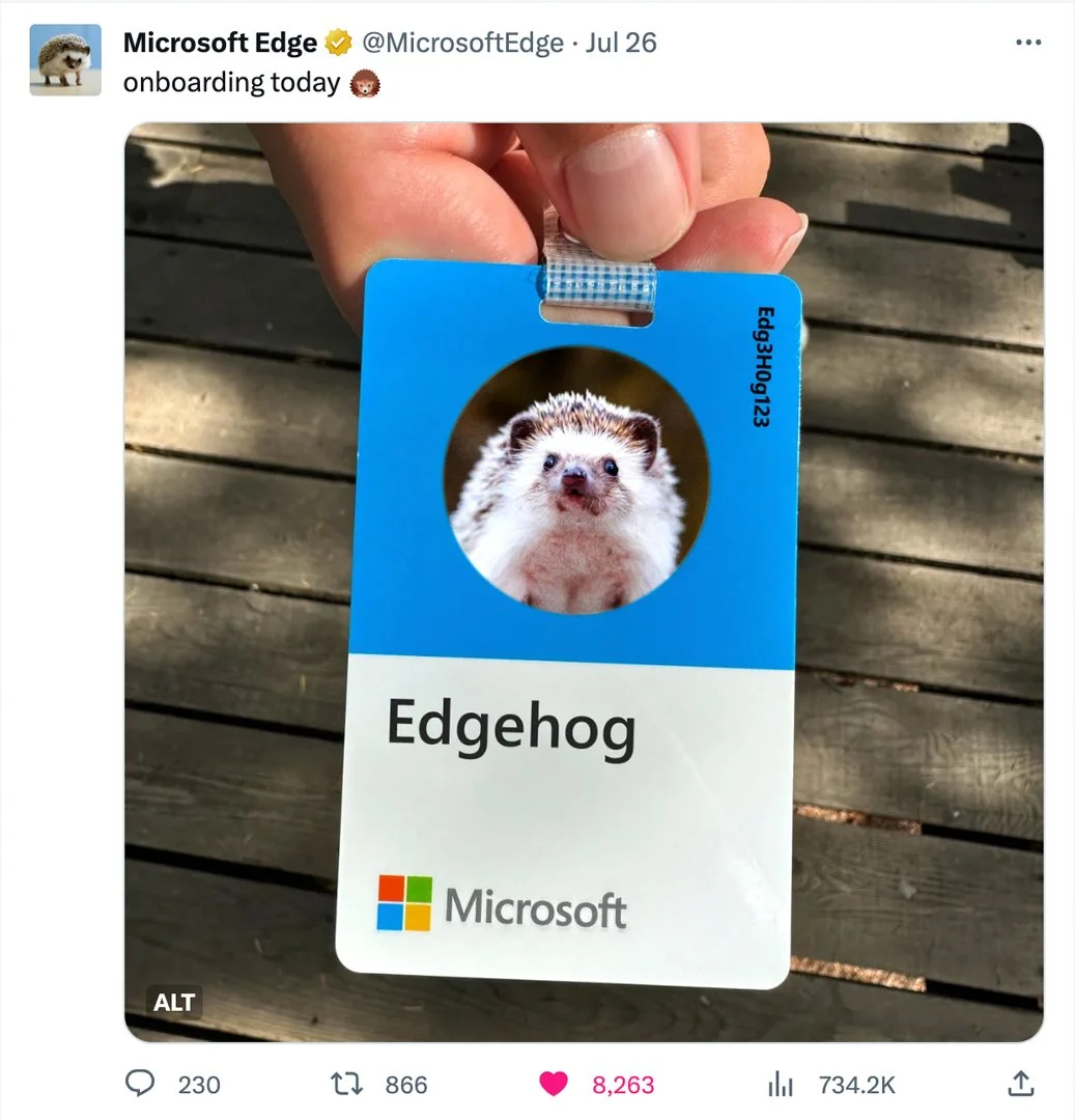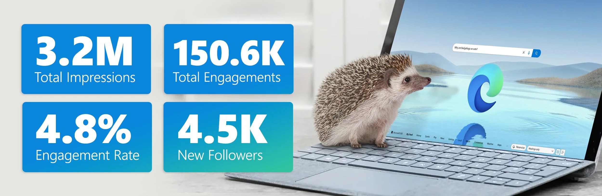 People think more about their laundry detergent than their browser, so we needed something to make people take notice of Microsoft Edge. And nothing gets people’s attention on social like cute animal content. Enter: the Edgehog. A social-first storytelling platform to build buzz and brand name recognition for Microsoft Edge. I.e., our social media manager got a hedgehog. This content all ran organically on X and some even became our most engaged-with pieces of content, raking in millions of views and generating a few headlines.